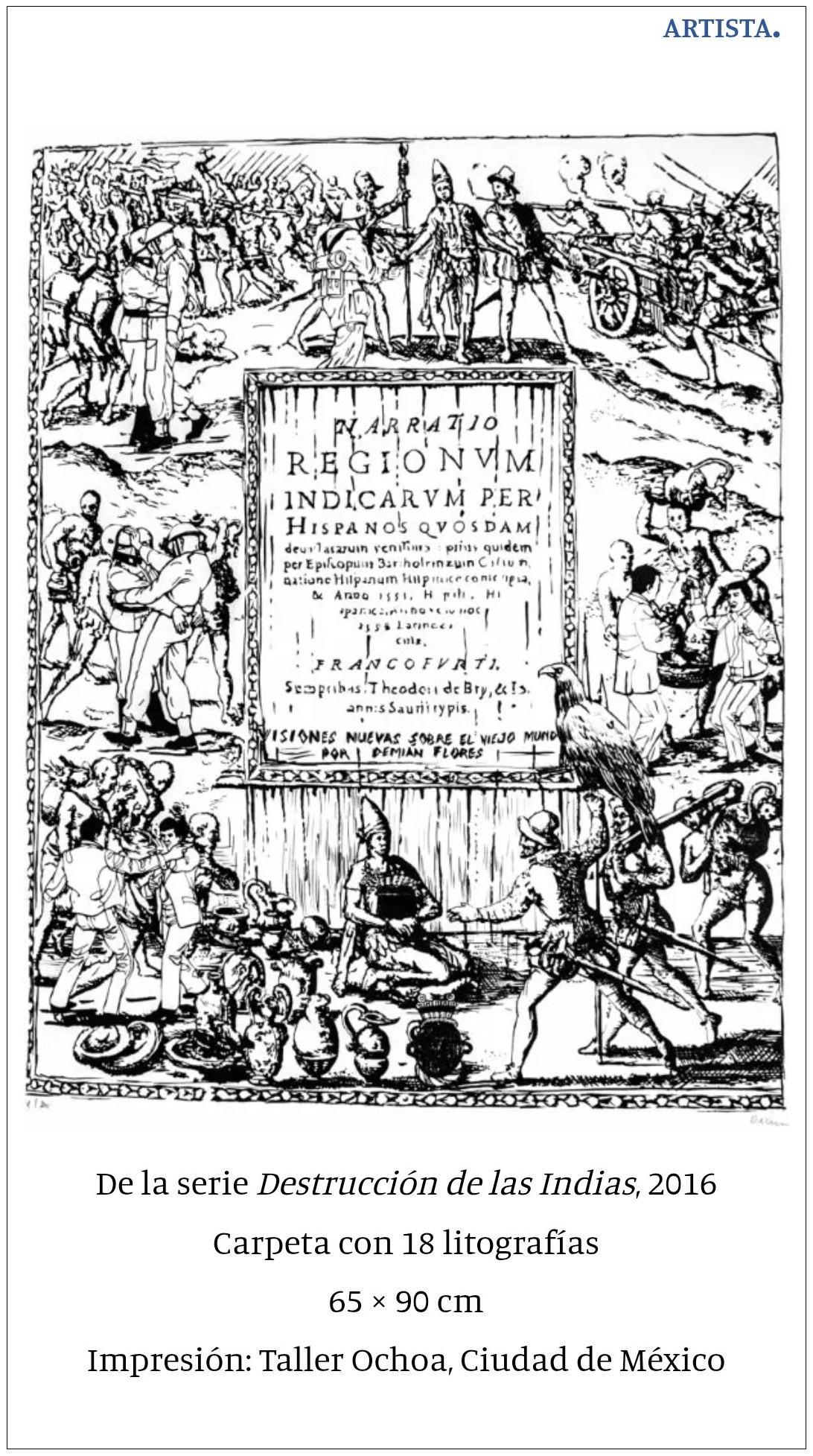 El palimpsesto creado por Demián sobre la obra de De Bry, forma una nueva narrativa para citar la historia reciente en México, específicamente los actos de violencia que aquejan a nuestra sociedad en la actualidad y que parecieran producto de una nueva “conquista”, una moderna “colonización” efectuada por el crimen organizado, cuya virulencia se apodera de territorios y personas con la misma ferocidad que la de los conquistadores de América en el siglo XVI».