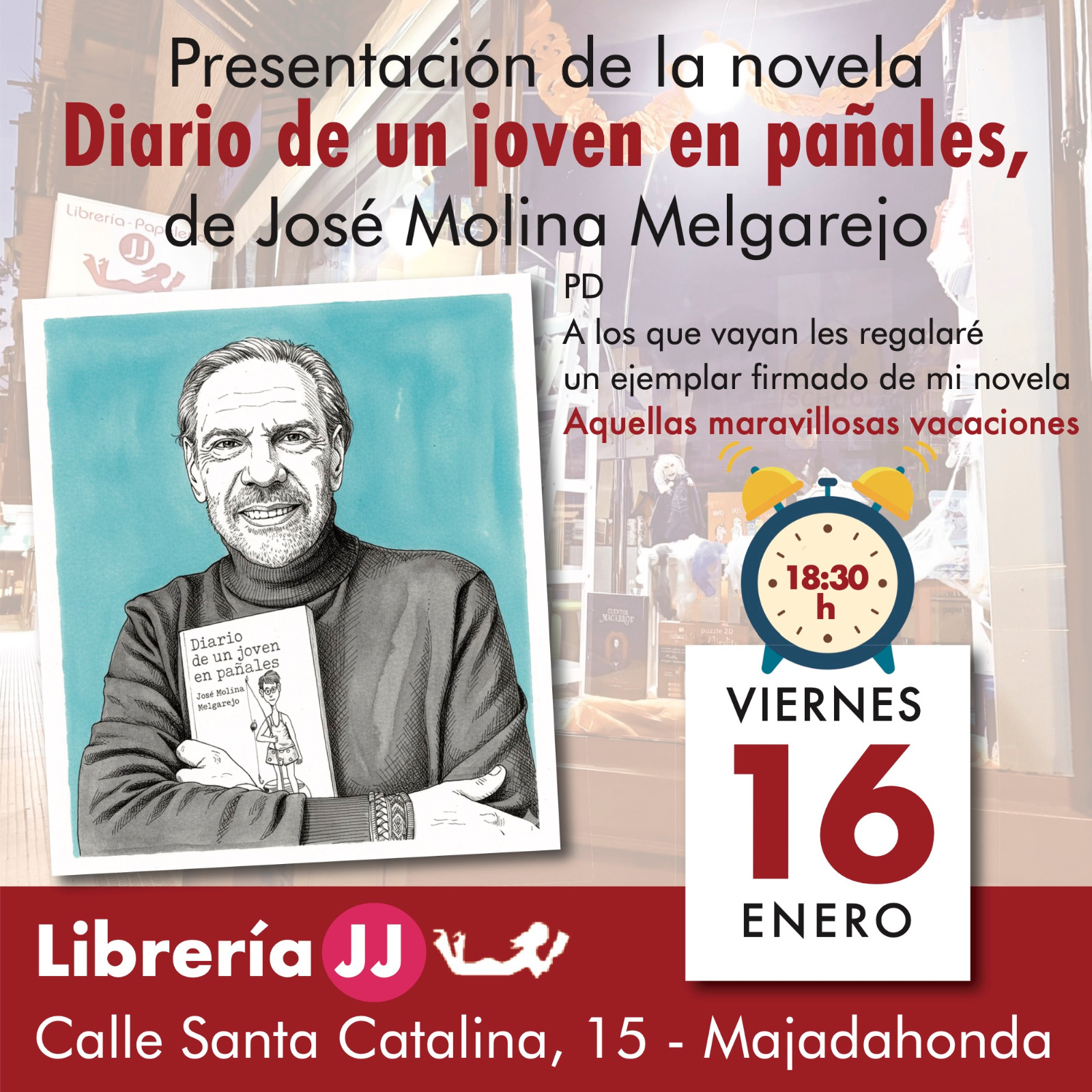 El viernes, 16 de enero del próximo 2026, se presenta la novela ‘Diario de un joven en pañales’, de José Molina Melgarejo. El acto tendrá lugar en la Librería JJ (Calle Santa Catalina, 15 de Majadahonda (Madrid) a las 18:30 y el acceso será libre hasta completar el aforo.