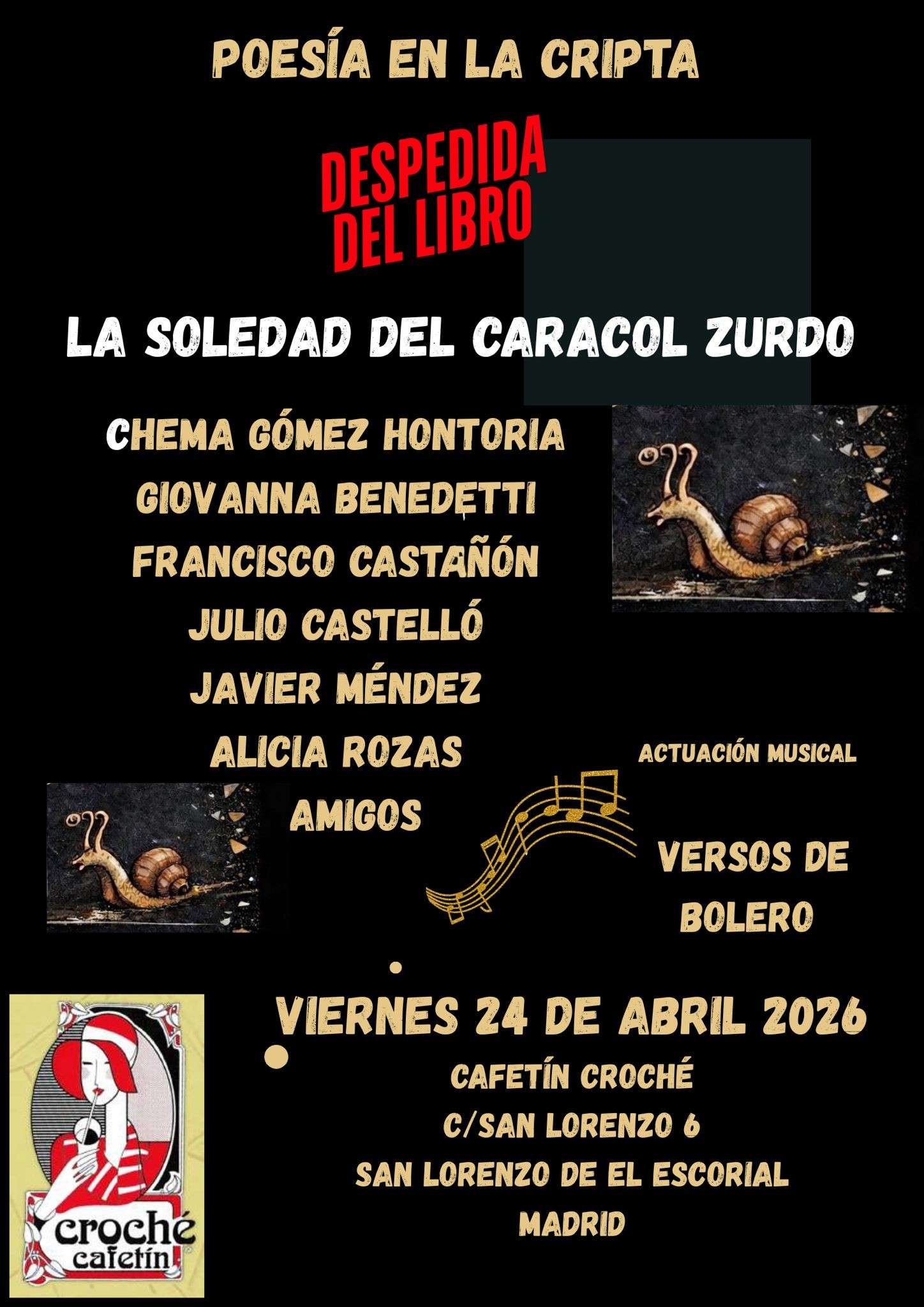 El acto tendrá lugar en la Cripta del emblemático Cafetín Croché de San Lorenzo de El Escorial, donde se celebra el ciclo mensual ‘Poesía en la Cripta’ que dirige Gómez Hontoria desde hace años.