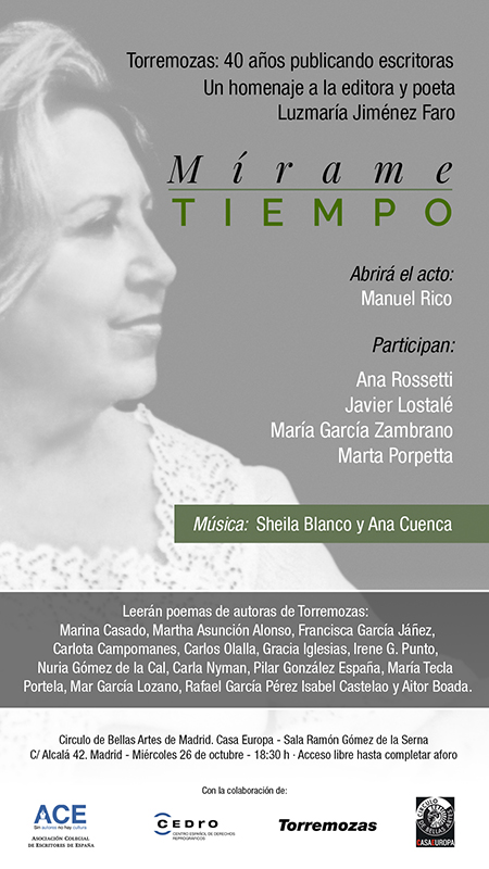 La Asociación Colegial de Escritores de España (ACE), con la colaboración de Ediciones Torremozas, CEDRO y el Círculo de Bellas Artes – Casa de Europa, ha organizado, en el marco del mes de las escritoras, un acto homenaje a los 40 años de Ediciones Torremozas y en reconocimiento a Luzmaría Jiménez Faro, su fundadora.