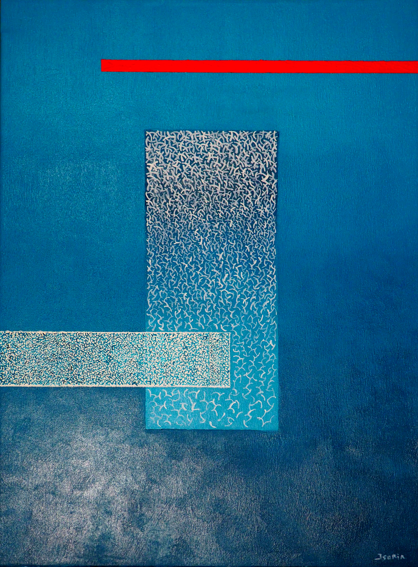 No hallé paralelismos biyectivos, como el anteriormente explicado, sino interpretaciones muy personales de estilos consagrados por la historia del arte. Jesús juega con el azar matérico —arena, yeso—, es por momentos un espacialista deudor del argentino Fontana. Busca hacernos saber que existe una realidad más allá del lienzo y cae en conceptualismos. Quiere salirse de la superficie pictórica, trascender el marco; quizás desilusionarnos o despertarnos. Acude al informalismo europeo y al expresionismo abstracto estadounidense porque no encuentra otro modo para exhalar el interior de su mundo. Por momentos recuerda las texturas con rayas rojas y blancas de Dennis Alter (Tensión, 2012) o las de Aykaz Arzumanyan. Allí estaba su reverencia a las coloridas abstracciones geométricas de Colin Lawson (Modus 3, 2020) y a las del turco Turan Büyükkahraman (144 Pintura), quien a todos sus cuadros de esa etapa de apego matemático, titulara igual: Pintura. Allí estaba su homenaje a Spencer Finch (¿Dónde empieza y dónde termina el rojo?, 2010) con una disección de las gradaciones de ese color que Jesús se encapricha por tomar en consideración como propias, y a Graciela Castro (Pensamientos en blanco y negro). También hay guiños al taiwanés Hsiao Chin (El mundo de los puntos rojos, 2016). Alude a la francesa Sophie Dumont, la de las bibliotecas imaginarias (La geometría del pensamiento, 2025). No escapa a cierto gusto que destapó el uruguayo Carlos Carnero en los años 50 y 60, discípulo predilecto de Fernand Léger, y se divierte simulando aquella etapa con una pieza muy graciosa. Su vista de la costa amalfitana, revela que las aldeas marineras convertidas en boutiques para la jet-set europea, no son más que favelas de moda que pueblan cerros con laberínticos accesos, una imagen que recordó a Falcón-Beracotti (Favela techos rojos, 2020).