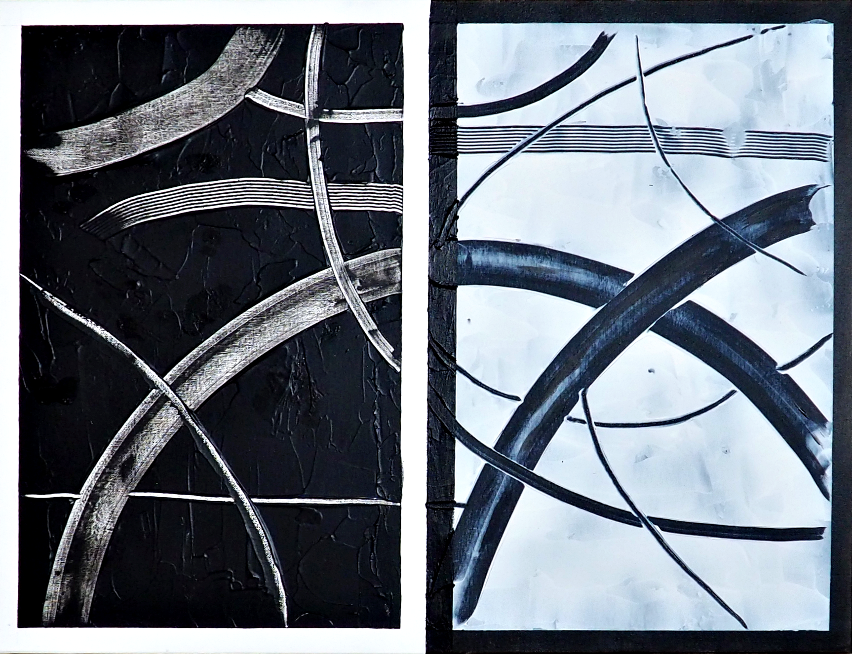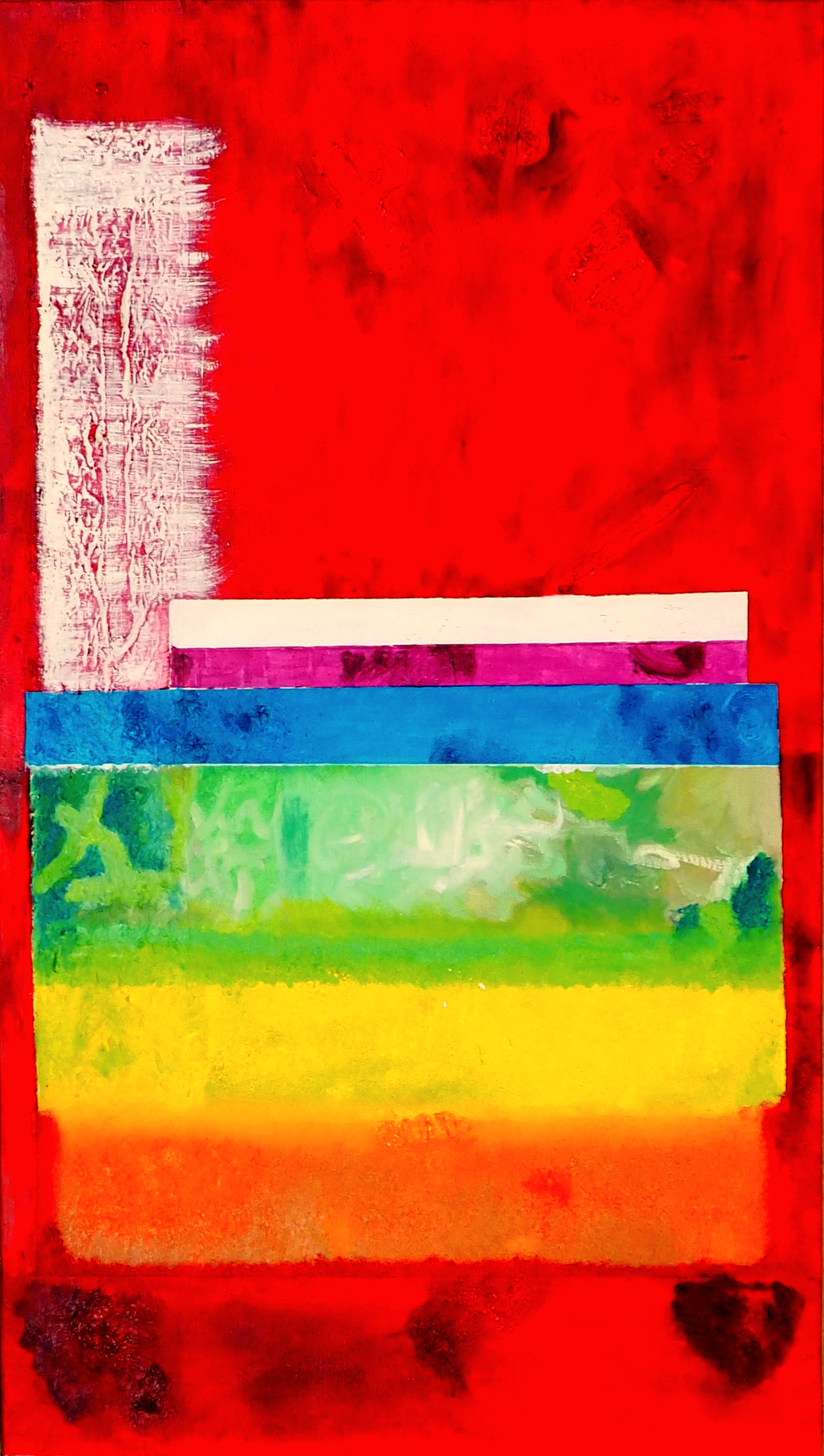 No hallé paralelismos biyectivos, como el anteriormente explicado, sino interpretaciones muy personales de estilos consagrados por la historia del arte. Jesús juega con el azar matérico —arena, yeso—, es por momentos un espacialista deudor del argentino Fontana. Busca hacernos saber que existe una realidad más allá del lienzo y cae en conceptualismos. Quiere salirse de la superficie pictórica, trascender el marco; quizás desilusionarnos o despertarnos. Acude al informalismo europeo y al expresionismo abstracto estadounidense porque no encuentra otro modo para exhalar el interior de su mundo. Por momentos recuerda las texturas con rayas rojas y blancas de Dennis Alter (Tensión, 2012) o las de Aykaz Arzumanyan. Allí estaba su reverencia a las coloridas abstracciones geométricas de Colin Lawson (Modus 3, 2020) y a las del turco Turan Büyükkahraman (144 Pintura), quien a todos sus cuadros de esa etapa de apego matemático, titulara igual: Pintura. Allí estaba su homenaje a Spencer Finch (¿Dónde empieza y dónde termina el rojo?, 2010) con una disección de las gradaciones de ese color que Jesús se encapricha por tomar en consideración como propias, y a Graciela Castro (Pensamientos en blanco y negro). También hay guiños al taiwanés Hsiao Chin (El mundo de los puntos rojos, 2016). Alude a la francesa Sophie Dumont, la de las bibliotecas imaginarias (La geometría del pensamiento, 2025). No escapa a cierto gusto que destapó el uruguayo Carlos Carnero en los años 50 y 60, discípulo predilecto de Fernand Léger, y se divierte simulando aquella etapa con una pieza muy graciosa. Su vista de la costa amalfitana, revela que las aldeas marineras convertidas en boutiques para la jet-set europea, no son más que favelas de moda que pueblan cerros con laberínticos accesos, una imagen que recordó a Falcón-Beracotti (Favela techos rojos, 2020).