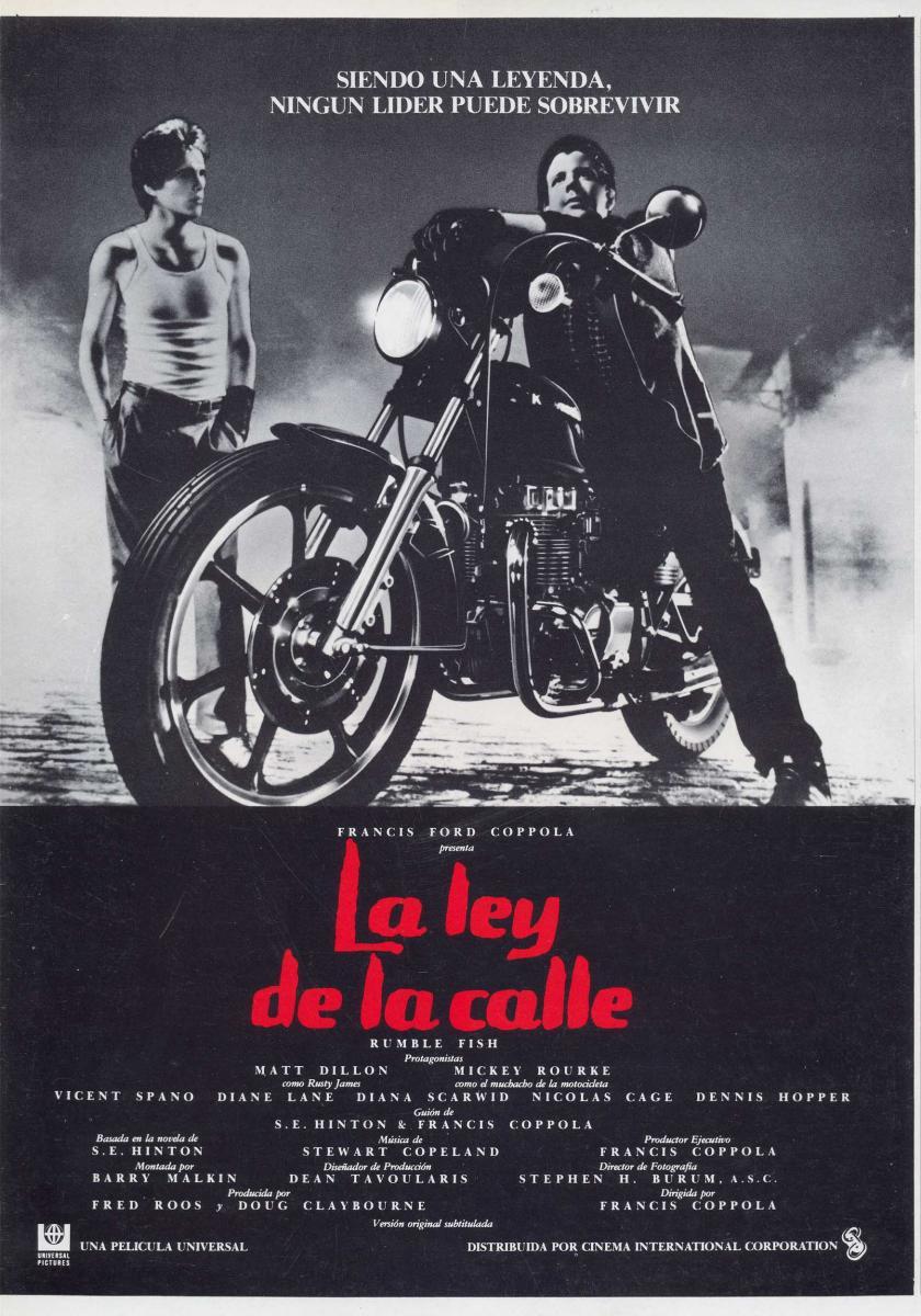 En este caso, me centro en La ley de la calle, basada en una novela de S. E. Hinton, que ya había adaptado Coppola en Rebeldes, rodada poco antes que esta. La película se filmó en 1982, con un reparto de caras conocidas del cine de la época, como Matt Dillon y Diane Lane, cuyas carreras posteriores han ido trazando un camino de ascensión, pero con altibajos en ambos casos. Muy atractiva era y es Diane Lane, aquella mujer inolvidable de otra película de Coppola, Cotton Club. El director contó también con rostros tan simbólicos como el de Dennis Hopper, uno de los actores que ya representó a un rebelde en Rebelde sin causa de Nicholas Ray y que trabajó con Coppola en la majestuosa Apocalipsis Now. Hopper había sido un rebelde en la famosa Easy Rider que levantó polvareda en toda una época con ese viaje iniciático de tres hippies (Peter Fonda, el inefable Jack Nicholson y el mismo Hopper) a un mundo que ya está cambiando (como nos recordaría Bob Dylan en su famosa canción). Contó para la película con un sobrino suyo, Nicolas Cage (futuro actor de éxito) y como productores asociados con sus hijos Roman y Gian-Carlo Coppola. Además de la futura directora e hijo del genial director, Sofía Coppola, como hermana del protagonista.