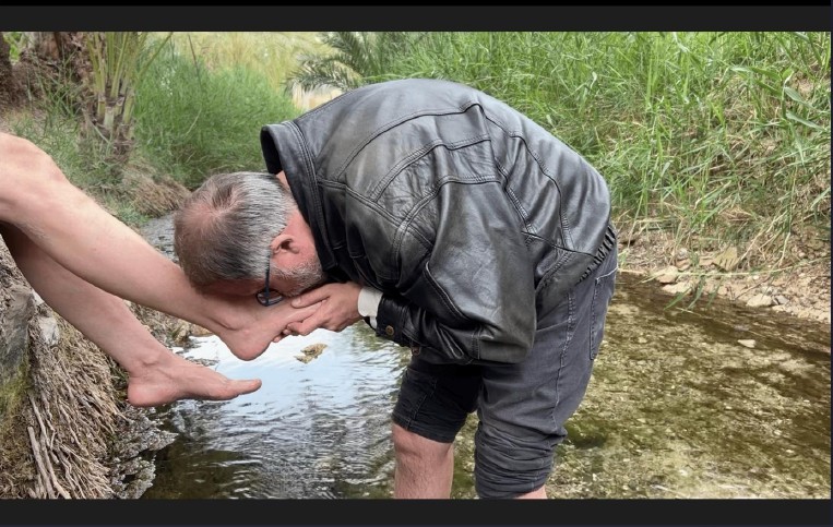 Tras esta escena, se nos muestra a José Luis y a Ada de cuerpo entero, apoyados espalda contra espalda. José Luis recita: «Afirmo el amor al abrigo de tus párpados…». Ada escucha silenciosa, quieta. En su quietud, adivinamos una actividad interior febril. Siguen juntos su camino. Llegan a una acequia de agua limpia, a un locus amoenus —por qué no, en la misma Orihuela—, en la que se recrea la escena del lavatorio. Cristo lavó los pies de sus discípulos antes de la Última Cena en señal de humildad y servicio. Aquí José Luis descalza a Ada, lava su pie desnudo y lo besa. Hay temblor, hay emoción, casi diría devoción y agradecimiento por una vida compartida. Recuerdo algunos versos de la poesía final de Miguel Hernández cuando trata a su mujer de igual manera: «¿Qué exaltaré en la tierra que no sea algo tuyo? / A mi lecho de ausente me echo como a una cruz / de solitarias lunas del deseo, y exalto / la orilla de tu vientre […]».