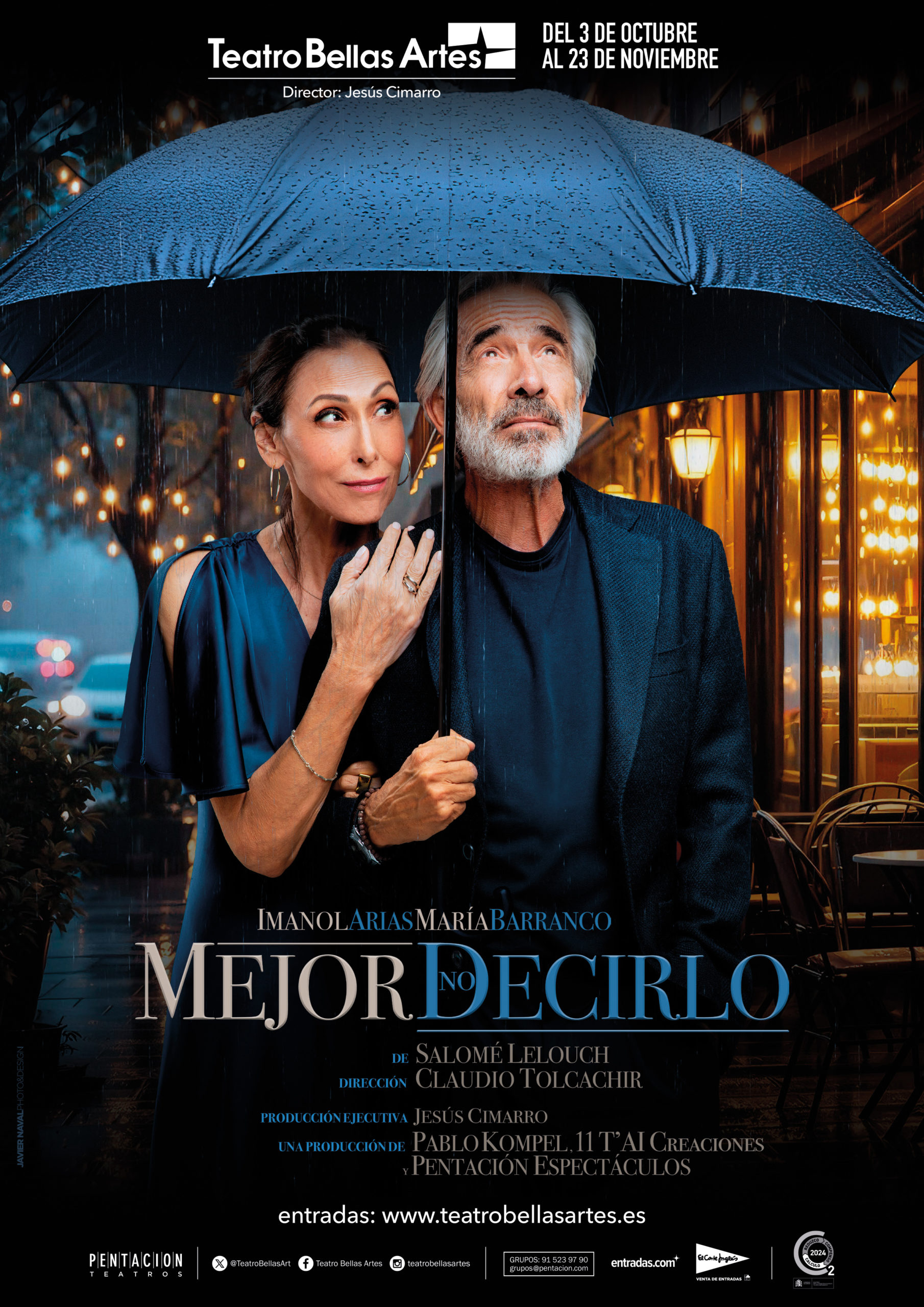 Hasta el próximo 23 de noviembre, el Teatro Bellas Artes acoge funciones de la muy interesante comedia conyugal Mejor no decirlo, dirigida con solvencia por Claudio Tolcachir y protagonizada por los excelentes intérpretes María Barranco e Imanol Arias. De la producción de la obra se encarga Pentación Espectáculos, a cuyo frente está don Jesús Cimarro.