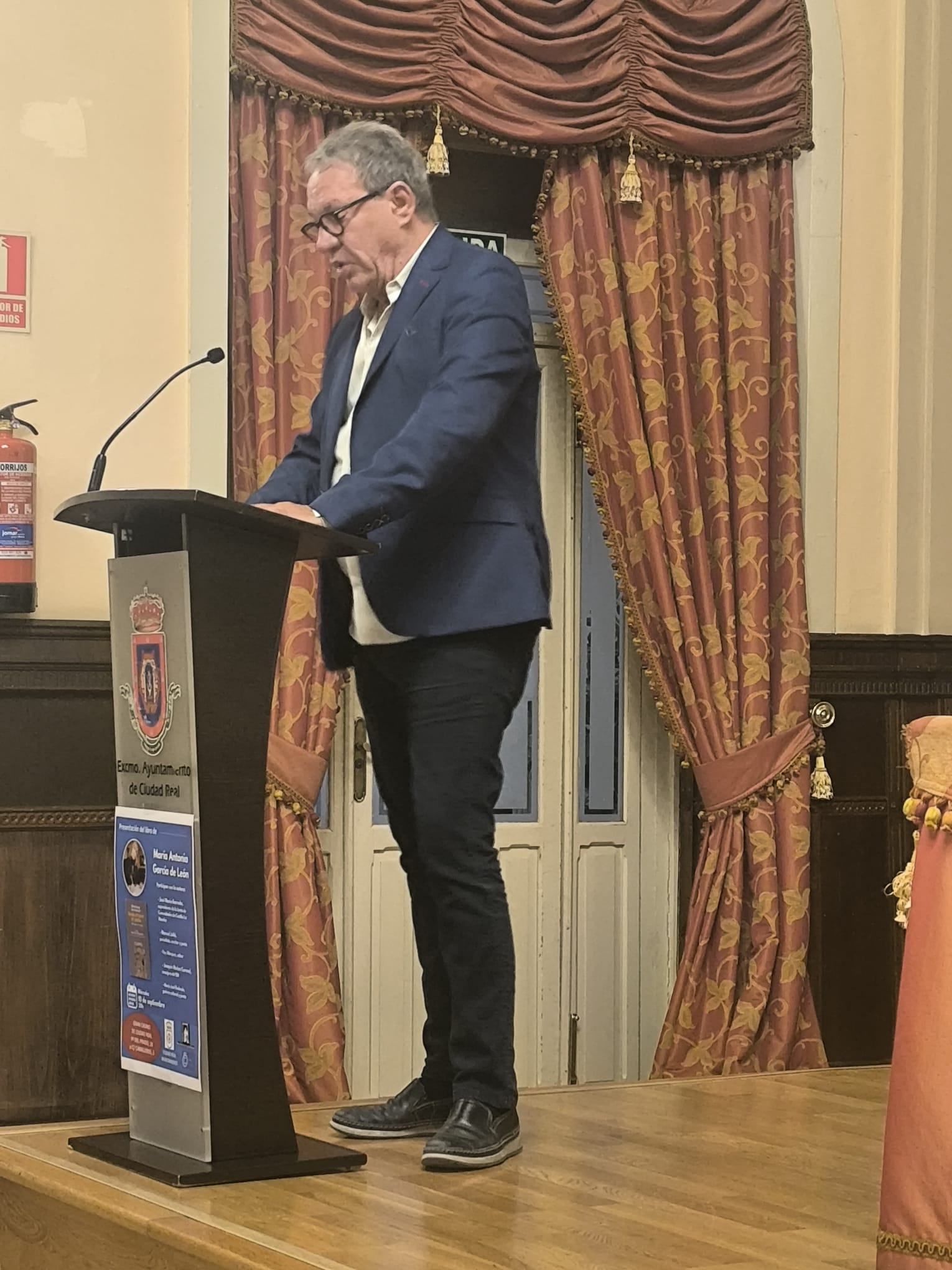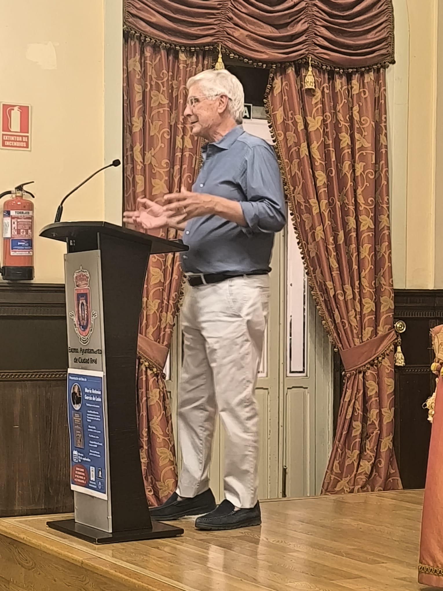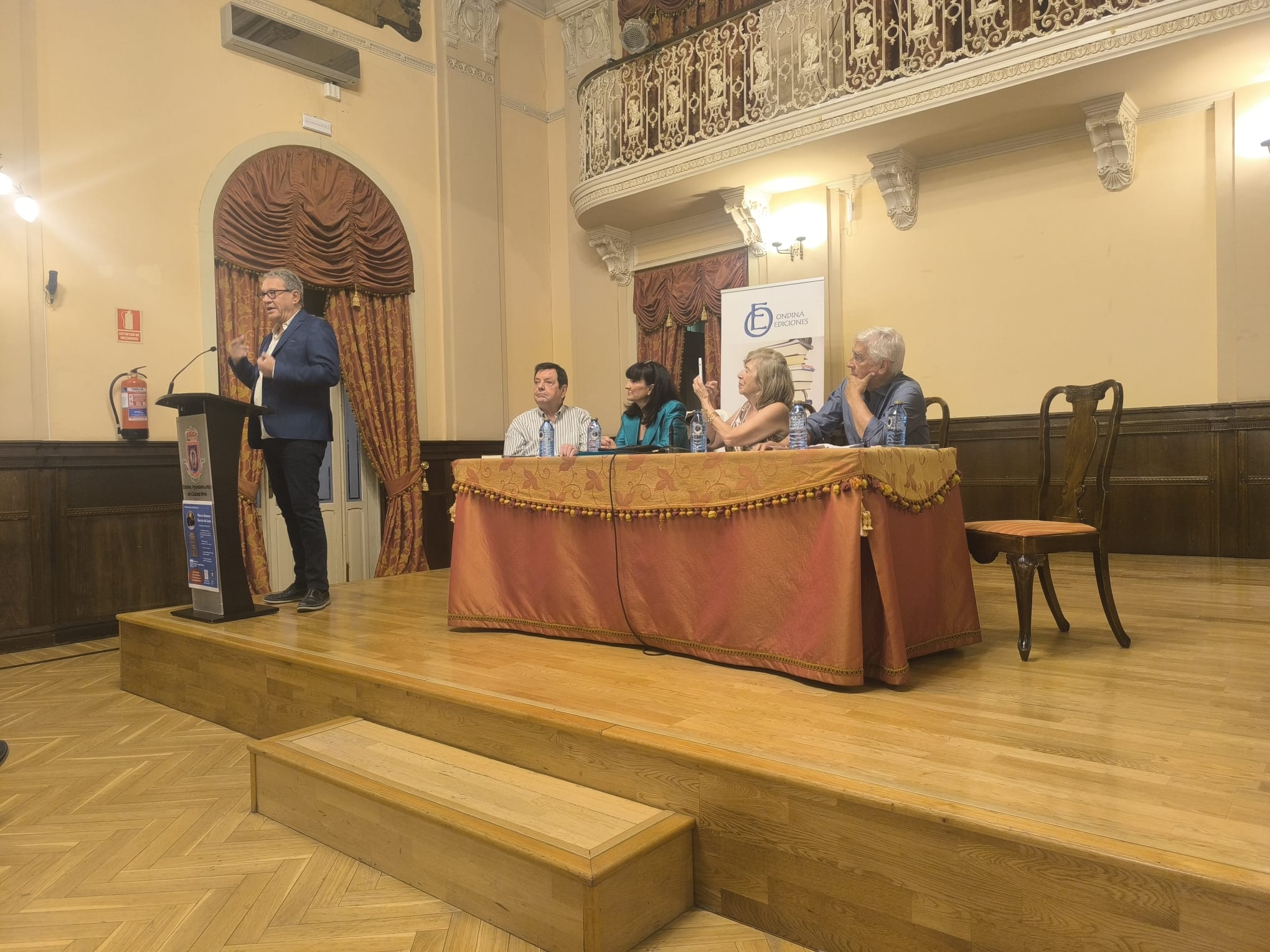 En el antiguo casino de Ciudad Real en el gran salón de actos lleno de público. Se dijeron cosas de gran interés, sobre los intelectuales (Manuel Juliá), o el escrito con aire cervantino y crítico: “Nunca la lanza embotó la pluma” de José María Barreda…